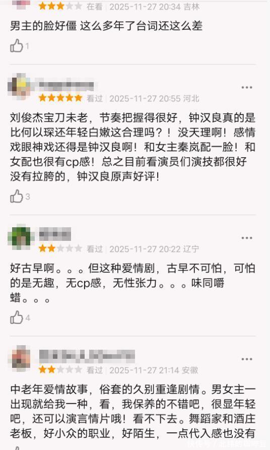 钟汉良平翘舌不分,秦岚声音沙哑 或许是为了氛围感,整体灯光昏暗,反倒是把钟汉良肤色黑、皮肤松弛的缺点给暴露了。 尤其笑着望向女主角的时候,嘴角的笑容是酸涩的,但脸颊上的苹果肌实在是松弛得不行。